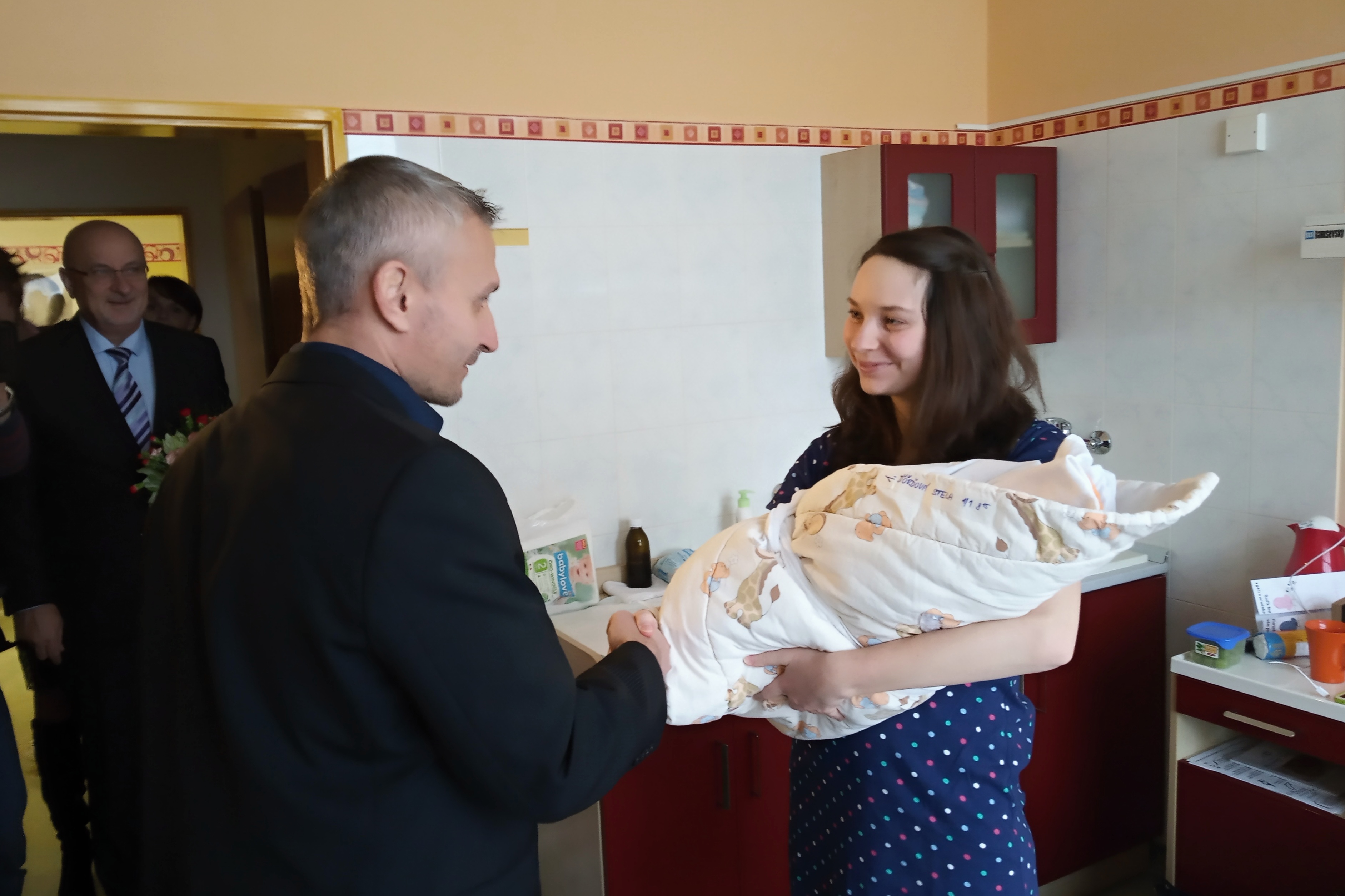 fotografie 2. - Maminka prvního letošního brodského občánka Alberta Čaňka přijímá gratulaci od starosty města Jana Tecla
