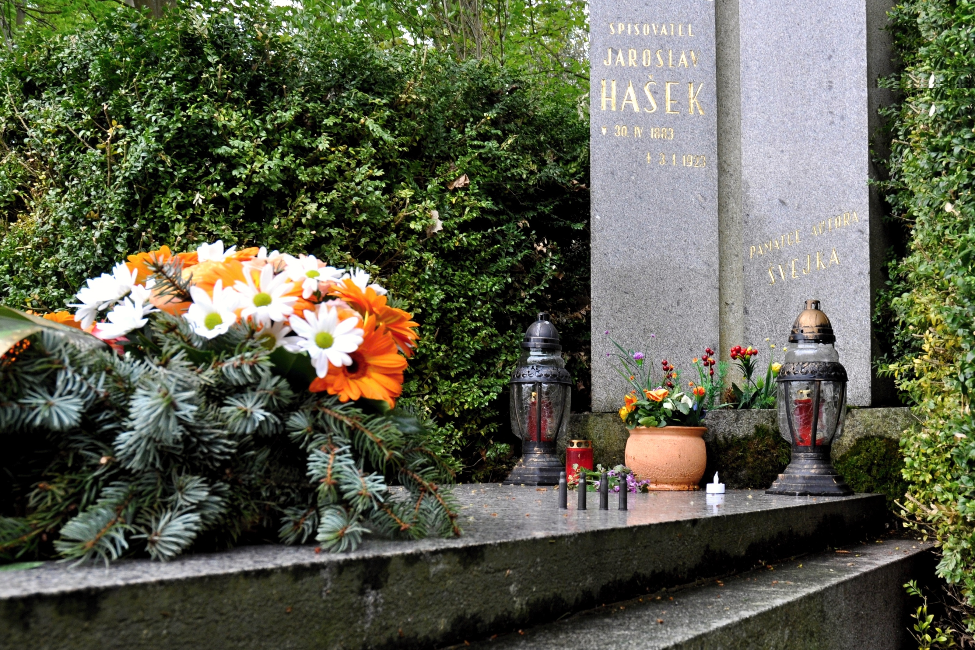 Lipnice 05 - Nejen kytice a drobné upomínky na lipnickém hrobě Jaroslava Haška dávají tušit, že autor „Osudů….“, vydaných v 58 jazycích světa, není zapomenut.